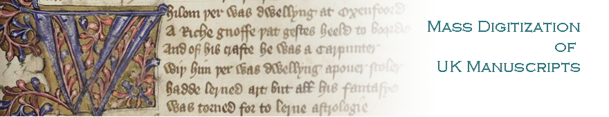 This website has been established as a forum for matters relating to the mass digitization of manuscript and other original textual materials preserved in the UK. The impulse for this is the recognition that digitization has the potential to transform scholarship throughout the humanities. We focus here on manuscripts surviving from before 1500, and on the first link in the digitization chain: the digital imaging of the original manuscripts themselves. The rapid maturing of digital photography, from extremely expensive devices capable of taking only a few pictures an hour (or a day!) to reasonably-priced devices capable of taking several hundred images an hour, has brought into prospect the possibility that whole collections of manuscripts might be photographed digitally (indeed — dare we say it — every manuscript in the UK dating from before 1500). Clearly, our discussions will be relevant to later and other original texts, and we hope others might learn from us, as we from them.